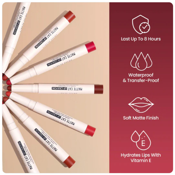 Designed to be waterproof and smudge-proof, the Matte Cat Lip Crayon stays in place no matter what the day brings, whether you're eating, drinking, or just going about your day. The hydrating formula keeps your lips soft and supple, so you can confidently rock vibrant lips without worrying about discomfort. Available in a range of stunning shades, this lip crayon is perfect for every occasion, from casual outings to glamorous nights out.